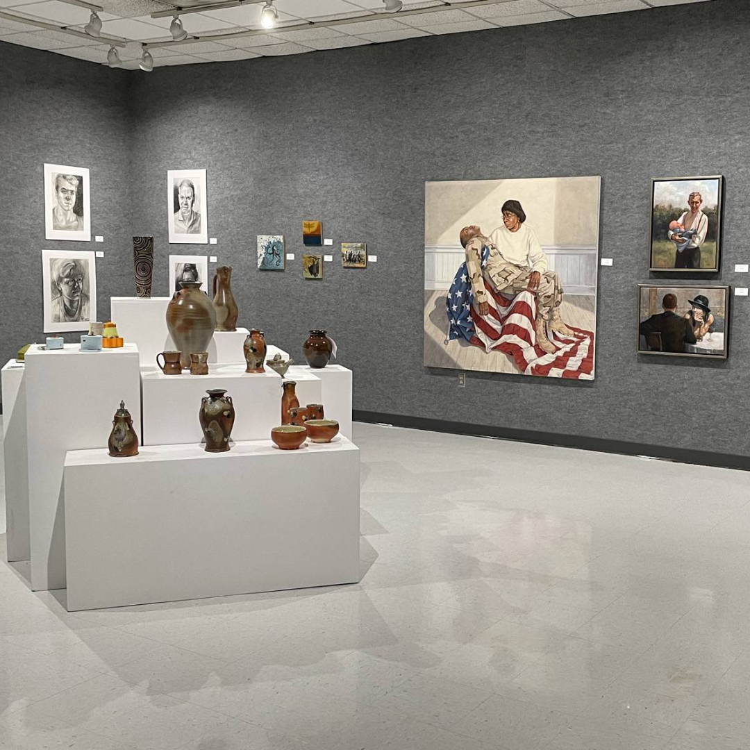 A contemporary art gallery showcasing works from local and regional artists, with unique pieces available for purchase.